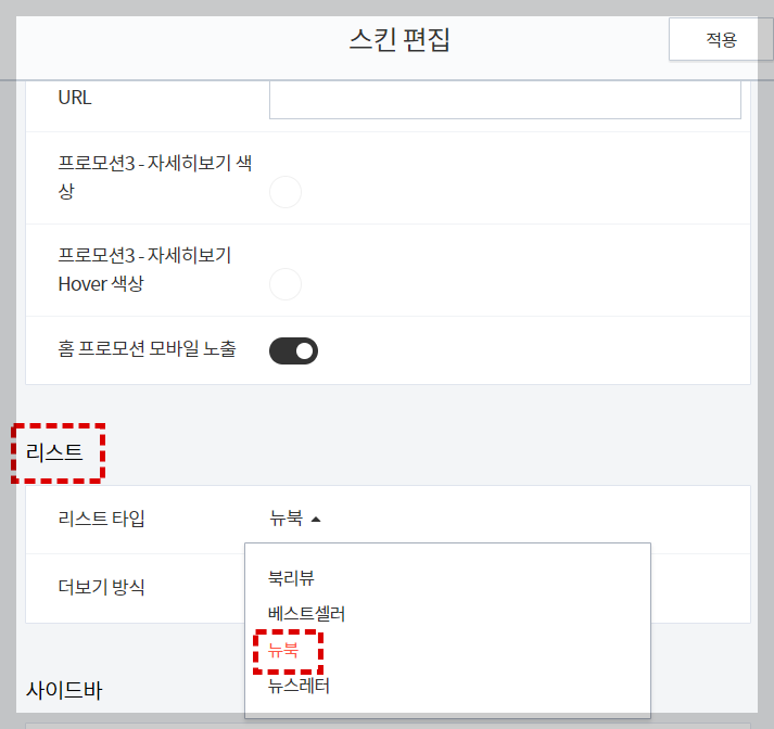 티스토리 블로그 관리로 들어가서, 스킨편집을 클릭하시고 마우스 스크롤을 쭉~ 밑으로 내리시면 오른편에 리스트가 나타납니다. 리스트를 북리뷰에서 뉴북으로 바꿔주세요.