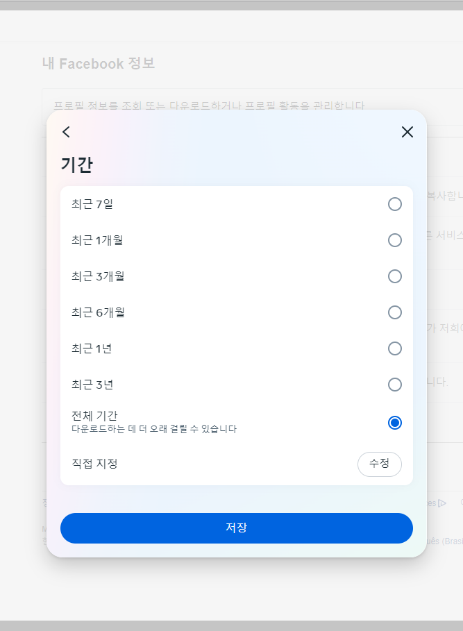 페이스북 백업은 게시물, 메시지 등 원하는 내용을 선택해서 백업받을 수 있고, 기간도 설정해서 다운로드할 수 있습니다. 초창기 페이스북을 생각해 보면 무척 친철해졌다는 생각도 드네요.