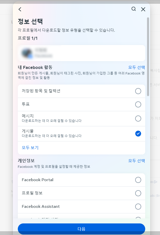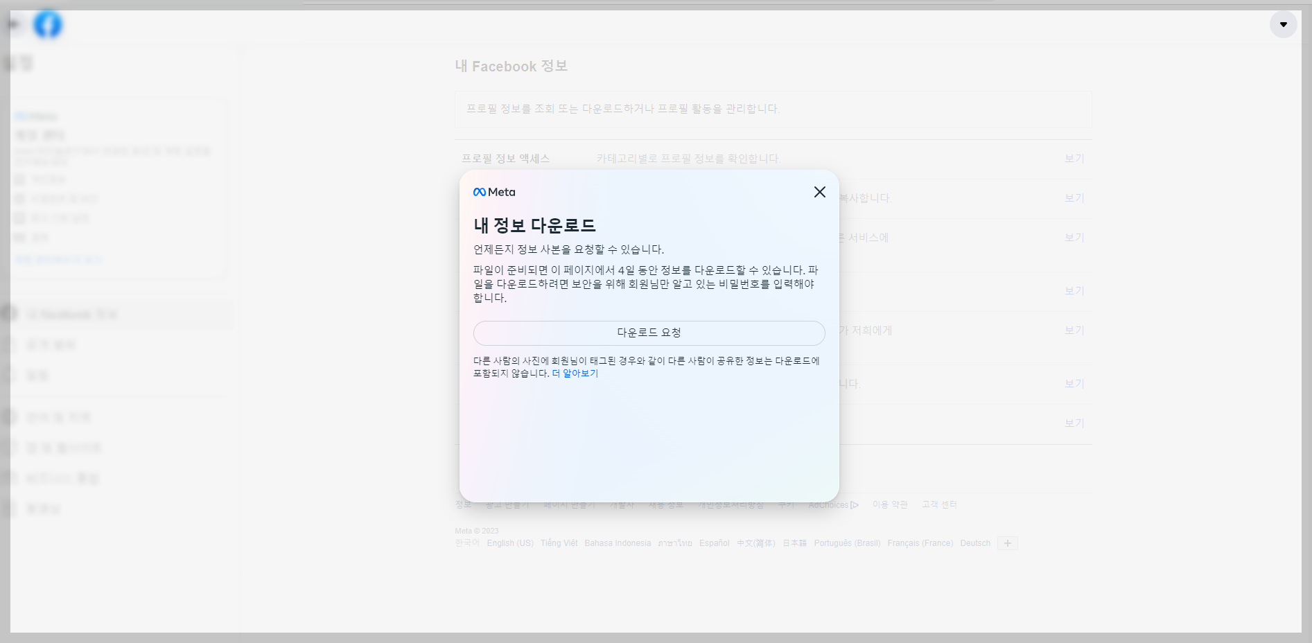 파란색 다음 버튼을 누르면 "내 정보 다운로드"가 바로 나타납니다. 여기에서 "다운로드 요청"을 클릭하시면 돼요.