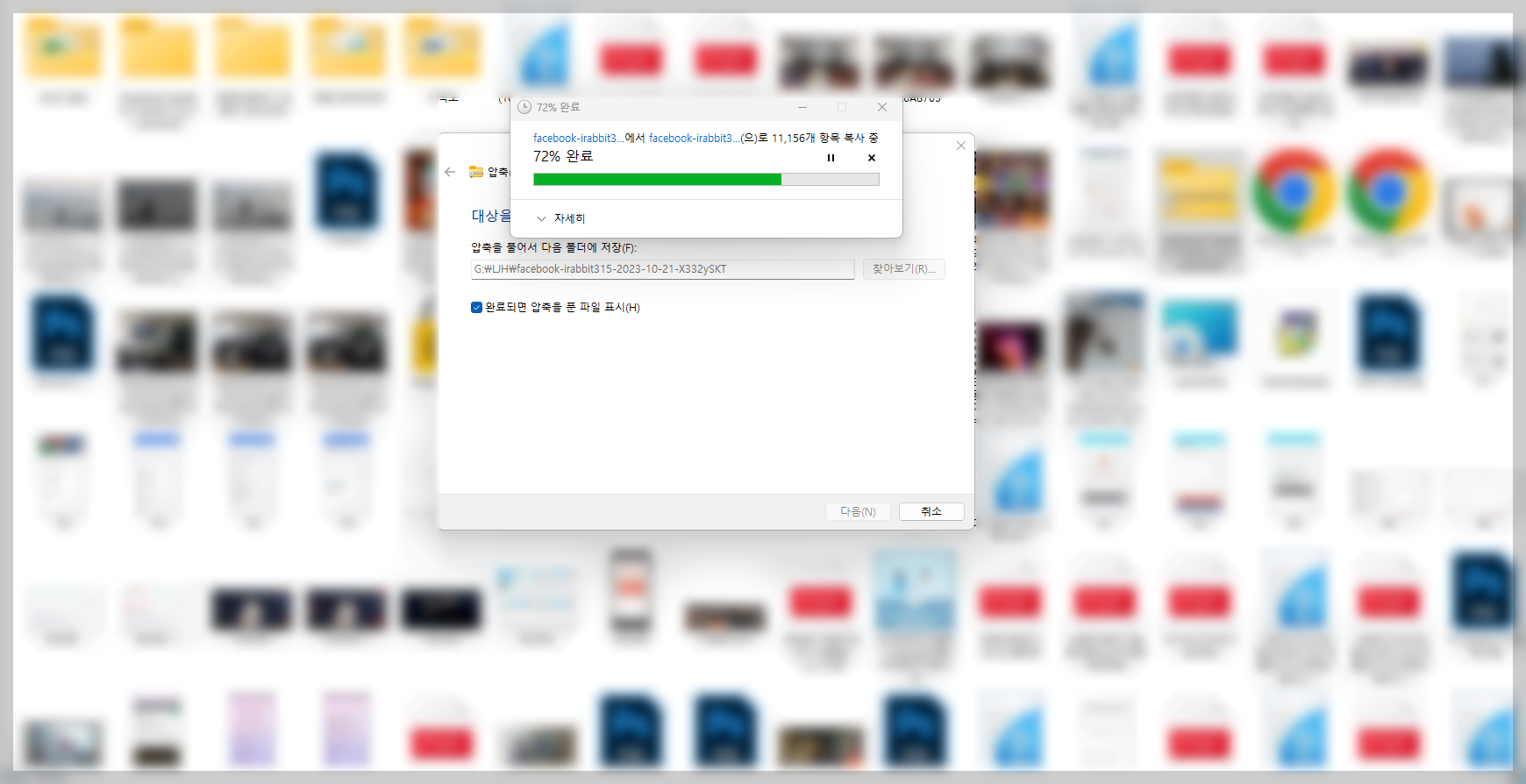 페이스북 PC 백업은 압축파일로 저장이 됩니다. 용량이 커서 그런지 생각보다 백업 시간이 오래 걸리더라고요.