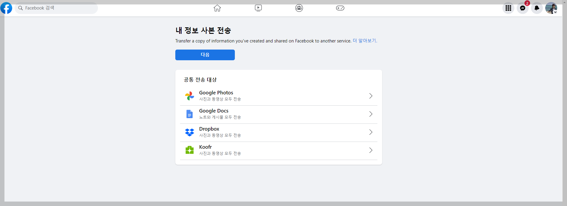 여기서, "내 Facebook 정보" 가운데를 보시면 "내 정보 사본 전송"이 있습니다. 그것을 클릭해 주세요.