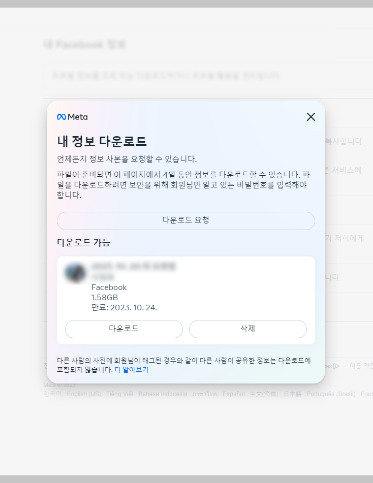 우와~~ 그동안 올렸던 페이스북 게시물(글과 사진)을 모두 다운로드하으니 무려, 1.58GB라네요. 저는, DSLR로 찍은 사진을 보관하는 사진첩 기능으로도 사용해서 그런지 용량이 생각보다 훨씬 많았습니다.