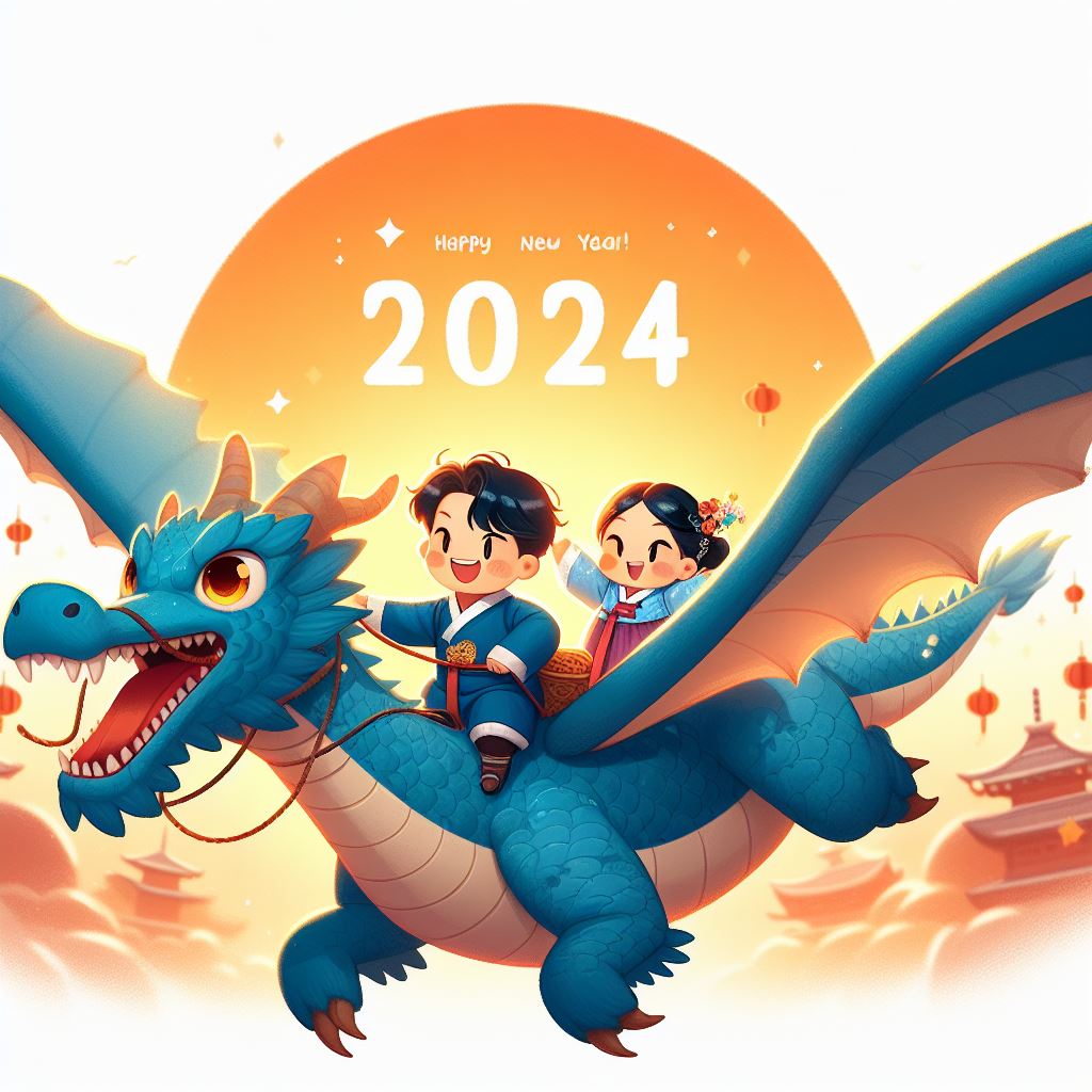 궁금한 마음에 AI 프롬프트에, "해가 막 떠오르는 배경에, 하늘로 힘차게 날아오르는 귀엽고 사랑스럽고 믿음직한 푸른 용이 한복 입고 인사하는 남자아이와 여자 아이를 등에 태우고, ' 2024 HAPPY NEW YEAR'라고 말하고 있음, 일러스트 이미지"라고 입력해 봤는데요.