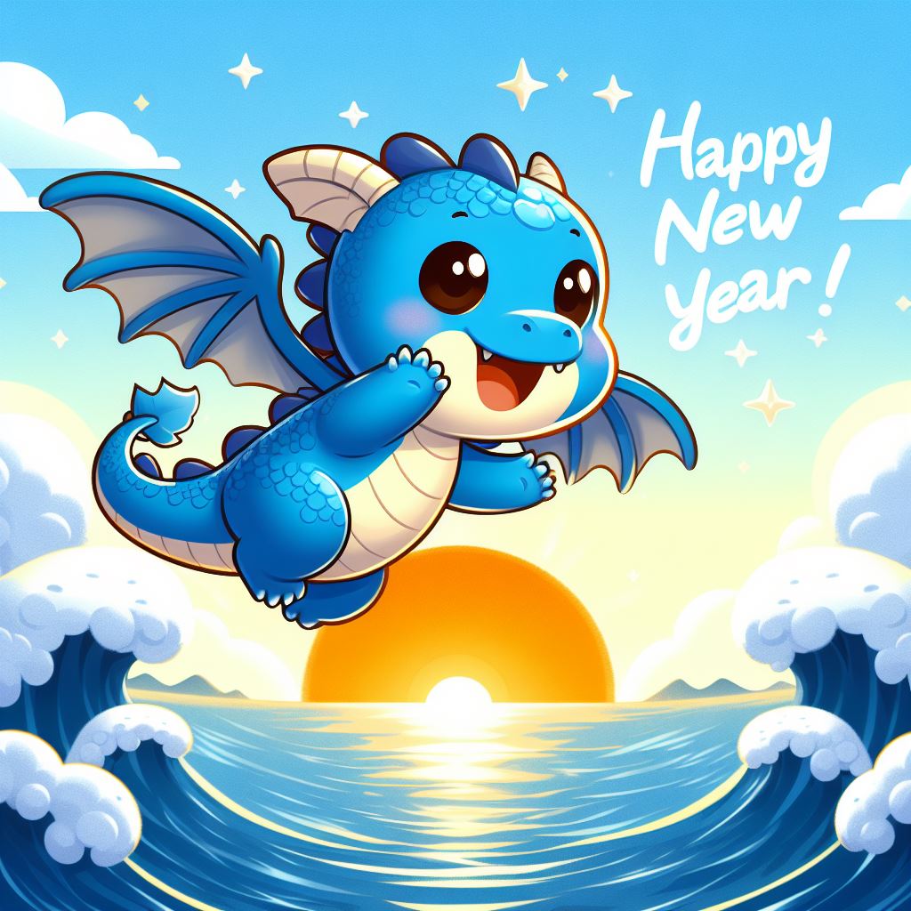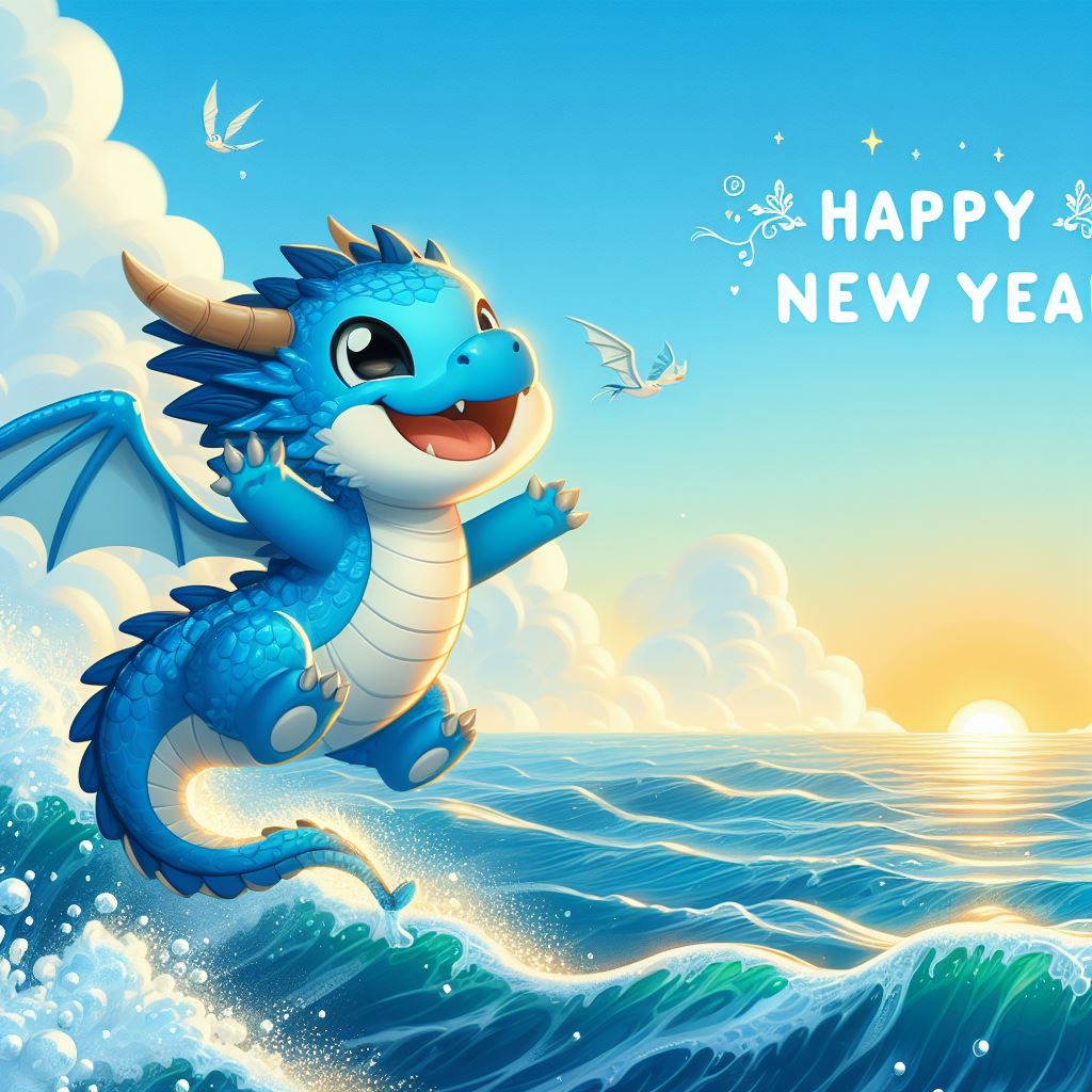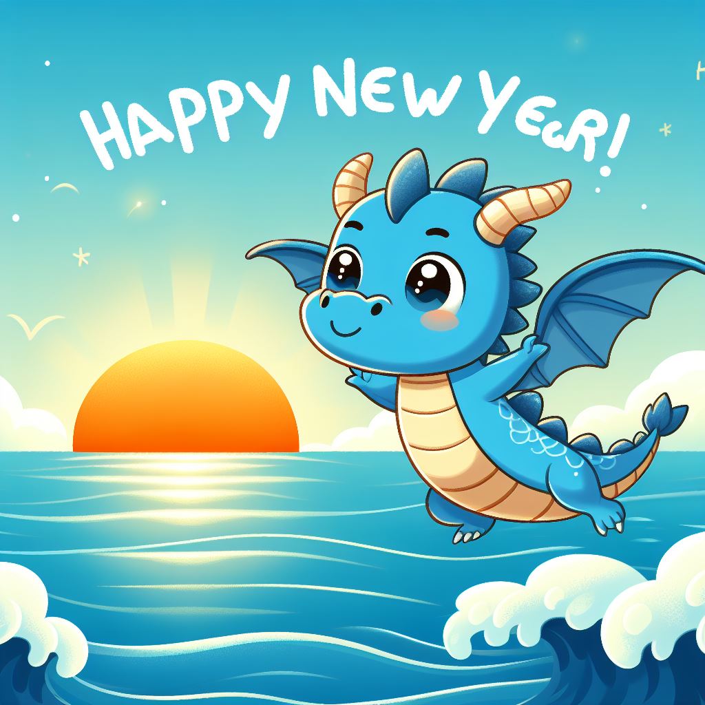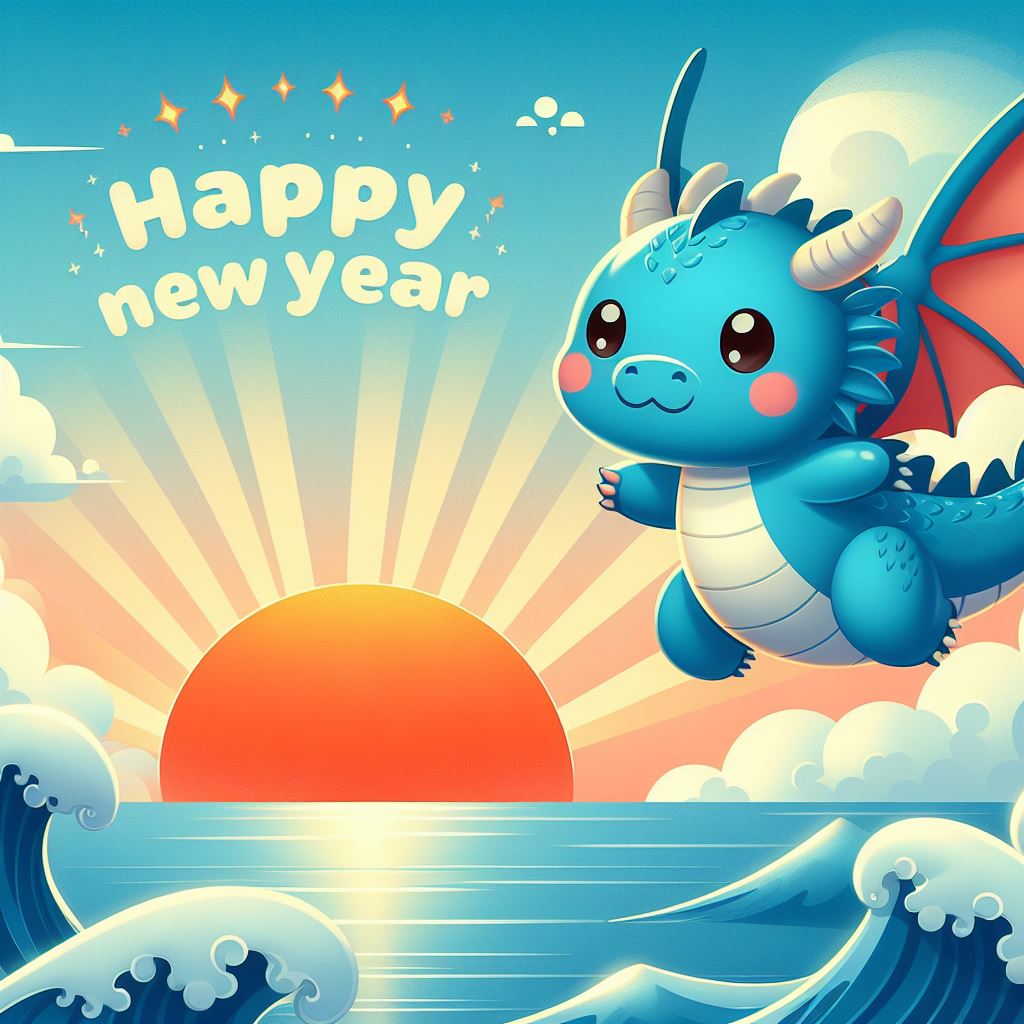 "해가 막 떠오르는 바다 수평선에서 하늘로 힘차게 날아오르는 귀엽고 익살스러운 푸른 용, 'HAPPY NEW YEAR'라고 말하고 있음, 일러스트 이미지", 이렇게 빙 이미지 크리에이터에 프롬프트를 입력해 얻은 청룡의 이미지입니다.
