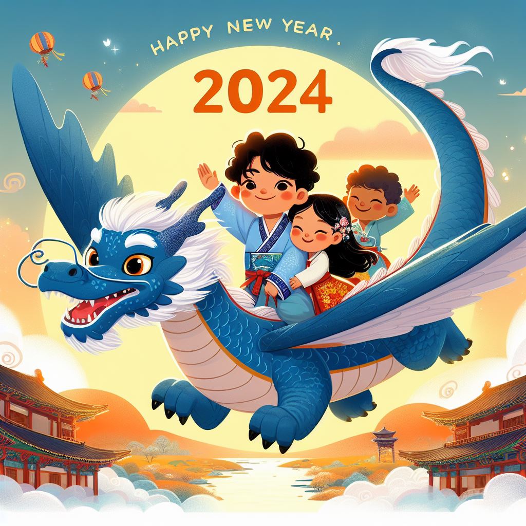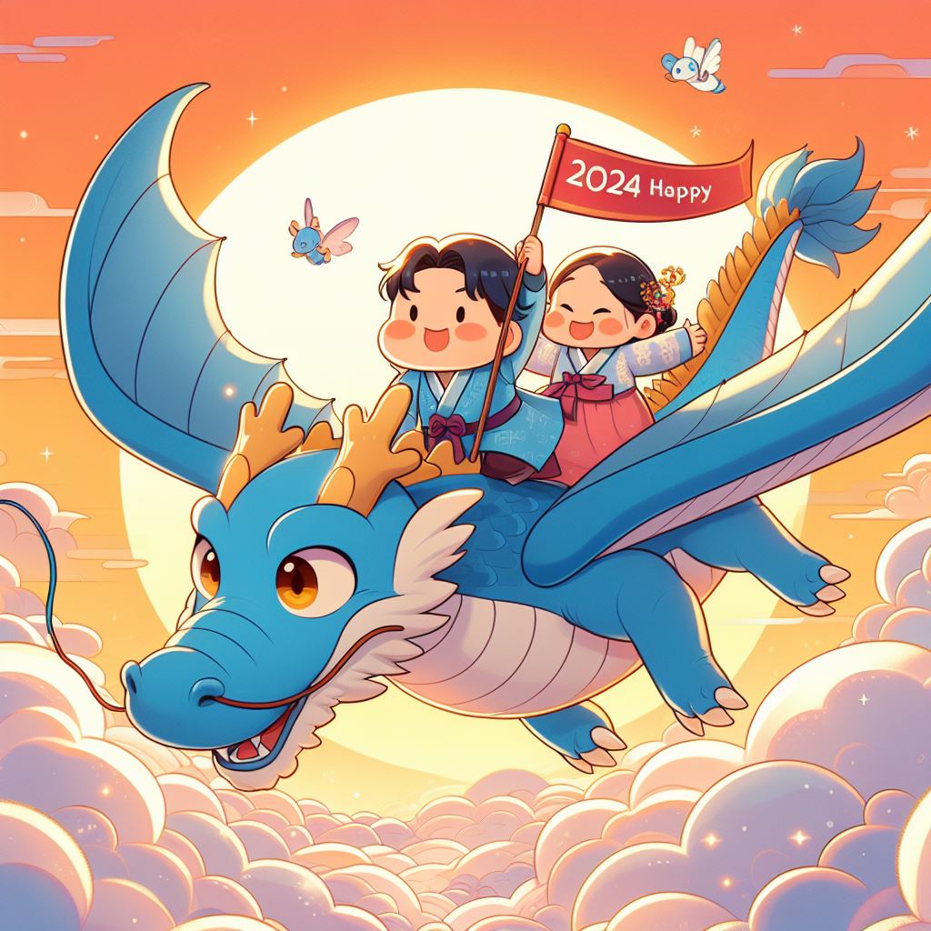 궁금한 마음에 AI 프롬프트에, "해가 막 떠오르는 배경에, 하늘로 힘차게 날아오르는 귀엽고 사랑스럽고 믿음직한 푸른 용이 한복 입고 인사하는 남자아이와 여자 아이를 등에 태우고, ' 2024 HAPPY NEW YEAR'라고 말하고 있음, 일러스트 이미지"라고 입력해 봤는데요.