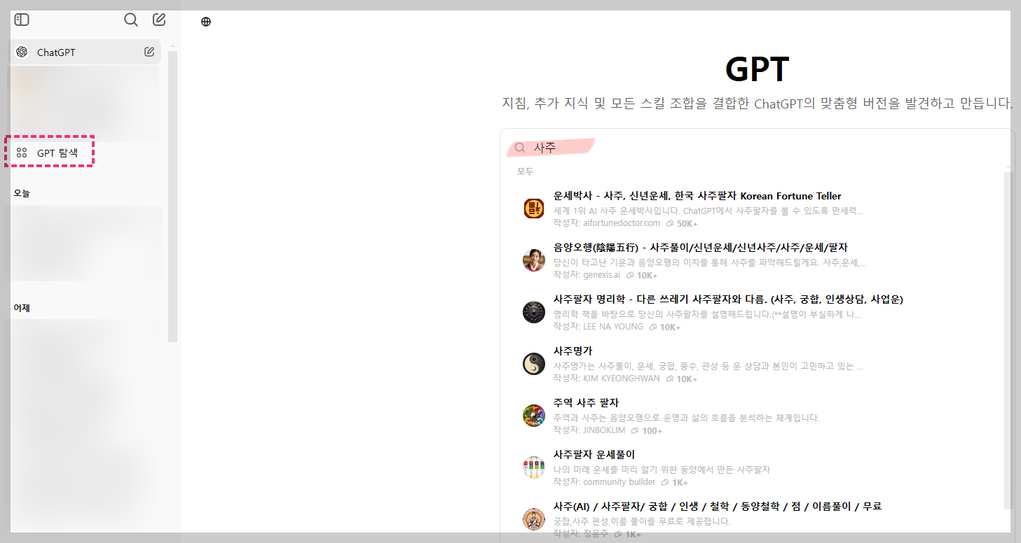 GPT 탐색을 클릭하시고, 그곳에 '사주'나 '운세'를 입력하시면 아주 많은 챗봇을 만나보실 수 있는데요. 앱스토어와 마찬가지로 사용자가 많은 것을 선택하시는 게 안전하실 수 있습니다. GPT스토어에 대해서는 제가 별도로 포스팅을 통해 자세히 소개해 드리도록 하겠습니다.