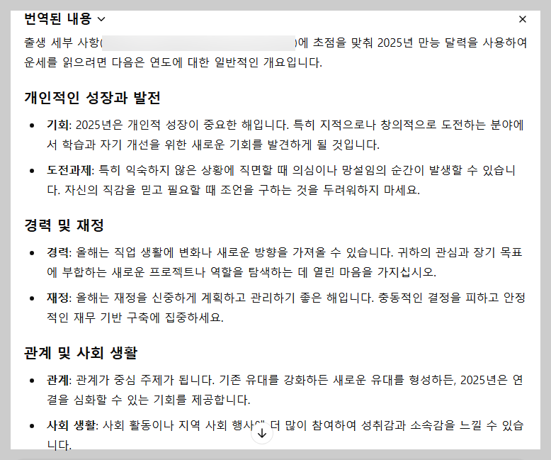 이렇게 입력해 보시기를 바랍니다. 아마, 생년월일과 출생시간, 성별만 입력했을때와는 전혀 다른 답변을 확인하실 수 있습니다. 이보다, 더 자세한 사주나 신년 운세를 확인하고 싶다면 내 만세력 이미지를 챗gpt에 업로드해 물어보는 것도 좋은 방법 중 하나입니다.