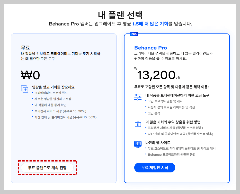 유료 버전은, 내 작품을 업로드해 크리에이티브 경력과 수익 창출을 목적으로 하시는 분들에게 추천드리는 버전입니다. 비핸스 유료 가격은, 한 달 13,200원입니다.(2025년 1월 기준)