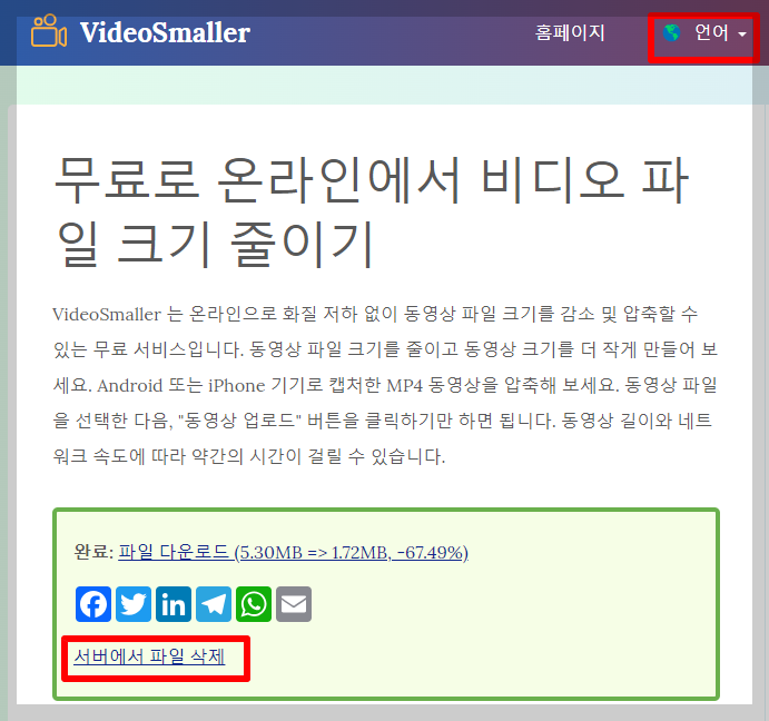 '동영상 업로드'를 누르고, 몇 초에서 몇 분 정도만 기다리면 용량이 줄어든 동영상을 다운로드하실 수 있습니다.